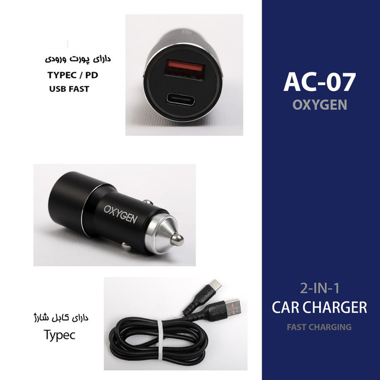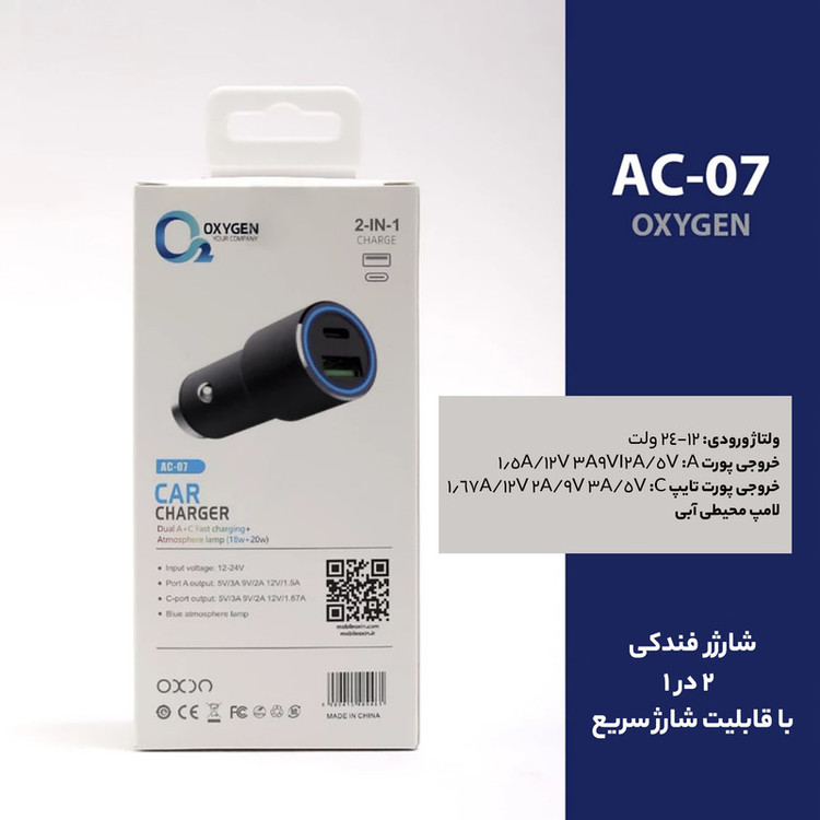 شارژرهای فندکی ماشین به دلیل استفاده راحت و در دسترس بودن برای جوامع امروزی وسیله ای کاربردی محسوب می شود. کمپانی OXYGEN شارژر فندکی مدل AC- 07 را برای متقاضیان این نوع شارژرها به بازار عرضه کرده است این محصول دارای دو خروجی USB و Type-c می باشد که توان خروجی 18 و 20 واتی دارد. و با توجه به نیاز دستگاه شما می باشد و جریان اضافه ای به دستگاه شما وارد نمی کند. و همچنین فست شارژ بودن این شارژر به کاربر این امکان را می دهد تا در کمترین زمان ممکن دستگاه هوشمند خود را شارژ کند. از ویژگی های دیگر محصول هم میتوان به جنس بدنه با کیفیت، طراحی زیبا، نوار LED آبی و دارا بود کابل Type-C در بسته بندی آن اشاره کرد.