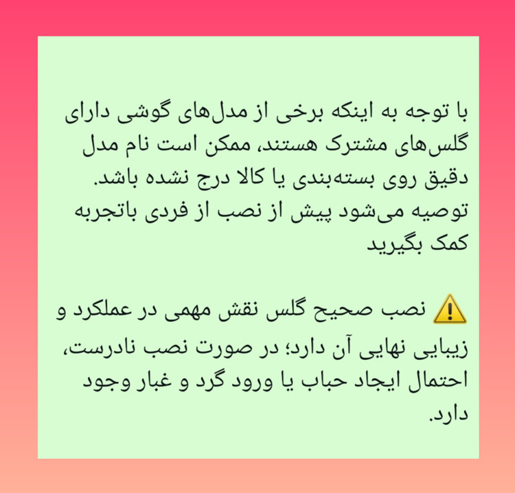با توجه به اینکه برخی از مدلهای گوشی دارای گلسهای مشترک هستند، ممکن است نام مدل دقیق روی بستهبندی یا کالا درج نشده باشد. توصیه میشود پیش از نصب از فردی باتجربه کمک بگیرید
