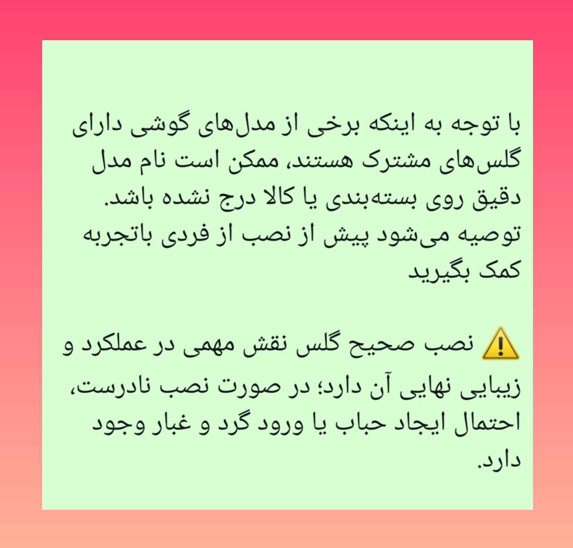 ⚠️ نصب صحیح گلس نقش مهمی در عملکرد و زیبایی نهایی آن دارد؛ در صورت نصب نادرست، احتمال ایجاد حباب یا ورود گرد و غبار وجود دارد.