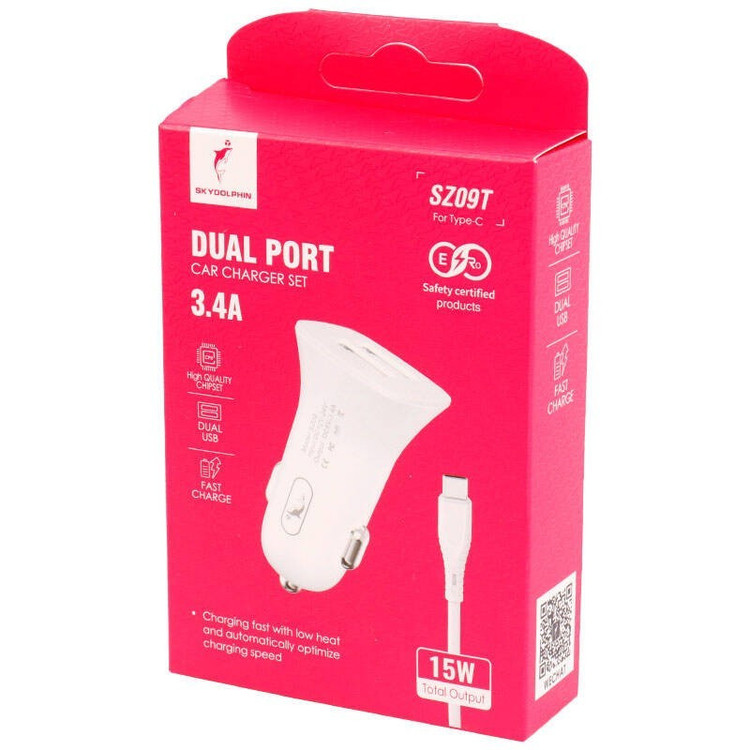 شارژر فندکی ماشین فست شارژ اسکای دلفین مدل SZO9 بدنه ساخته شده از جنس پلاستیک ABS و PC مقاوم در برابر حرارت و آسیب های احتمالی همچون ضربه و فشار را دارد. این شارژر دارای دوعدد پورت خروجی USB با پشتیبانی از فناوری شارژ سریع و توان خروجی 15 وات و همراه یک عدد کابل تایپ سی به طول 100Cm با روکش از جنس پلاستیک، مقاوم در برابر کشش و پارگی است . میزان ولتاژ ورودی این شارژر 12 الی 24 ولت، شدت جریان خروجی معادل 3.4 آمپر در ولتاژ 5 ولت می باشد و همچنین دارای چیست هوشمند جهت محافظت از اتصال کوتاه، حرارت و ولتاژ بیش از حد و ... است . شارژر فندکی فست شارژ Sky Dolphin SZ09 3.4A 15W موفق به کسب استاندارد های سلامت و ایمنی محصولات شامل CE / FCC / RoHS شده است.
