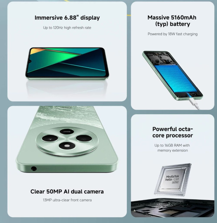 گوشی موبایل شیائومی مدل Poco C75 یکی از جدیدترین محصولات سری محبوب پوکو است که با ظرفیت ذخیرهسازی 256 گیگابایتی و هشت گیگابایت رم به کاربران عرضه شده است. این گوشی با طراحی جذاب و شیک خود، در سه رنگ مشکی، سبز و طلایی وارد ارائه شده و به دلیل بدنه شیشهای و وزن 204 گرمی، حس خوشایندی به کاربران القا میکند. همچنین، نمایشگر 6.88 اینچی این گوشی از نوع IPS LCD است که نرخ تازهسازی 120 هرتز و روشنایی 600 نیتی را برای تجربه بصری روان و واضح در اختیار کاربر قرار میدهد. در کنار این نمایشگر با کیفیت، چیپست MediaTek Helio G81 Ultra و پردازنده هشتهستهای با معماری 12 نانومتری، عملکردی سریع و پایدار را تضمین میکنند. این دستگاه مجهز به دوربین اصلی 50 مگاپیکسلی و دوربین سلفی 13 مگاپیکسلی است که امکان ثبت عکسهای خیرهکننده و فیلمبرداری با وضوح 1080p را فراهم میآورد. باتری 5160 میلیآمپر ساعتی با قابلیت شارژ سریع 18 وات، نیاز شما به انرژی را بهخوبی تأمین میکند. با رابط کاربری HyperOS بر پایه اندروید 14، تجربهای مدرن و کاربر پسند در استفاده از این دستگاه خواهید داشت. در مجموع پوکو C75 یک اقتصادی است که به مشخصات میانرده مجهز شده و به همین دلیل ارزش خرید بالایی دارد.